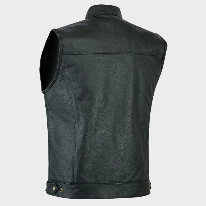 This Classic Black Leather Biker Vest merges timeless biker aesthetics with reliable on-road performance. Built from thick, top-grade cowhide leather, it’s built to last while gradually molding to your shape. The heavy-duty front zipper and snap-button storm flap lock out wind, and dual chest and waist pockets offer secure storage. With adjustable side straps, you can fine-tune the fit for comfort whether worn over a tee or riding jacket. Its standout feature is the smooth back panel, perfect for patches or custom embroidery in your club’s colors. The mandarin collar adds that signature biker look, and reinforced stitching throughout ensures the vest holds up through miles of use.