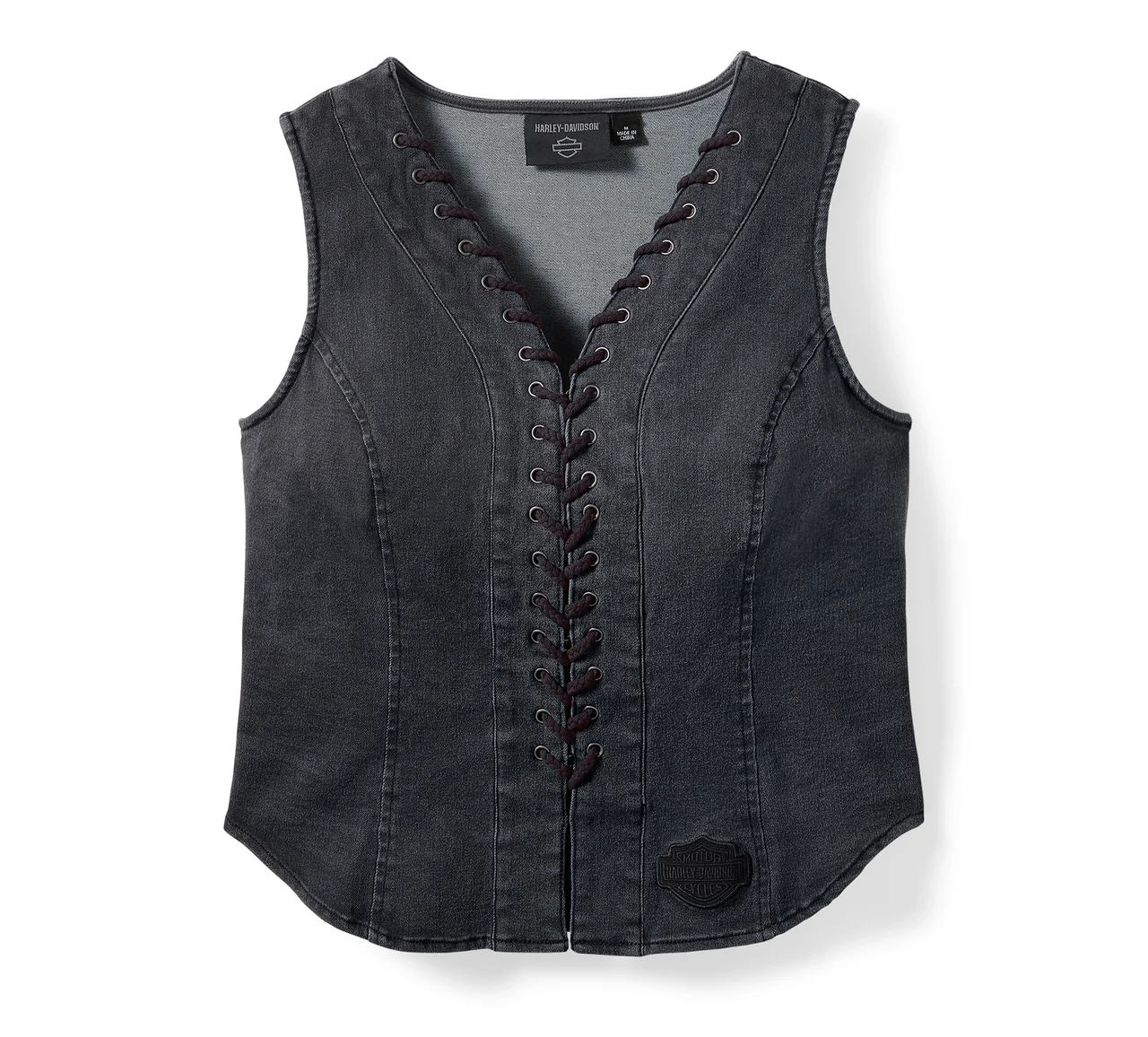The “Harley-Davidson women’s denim biker vest” delivers a bold mix of comfort, edge, and feminine style. Designed in washed black denim with a curved, contour fit, this ladies black denim biker vest feels light, breathable, and easy to wear. The lace-up motorcycle vest front adds a custom, corset-style touch that enhances shaping while keeping the look authentically moto. With subtle Harley-Davidson branding and a classic vintage denim look, it’s the perfect pick for riders wanting a stylish women’s Harley-Davidson denim vest without going over the top.