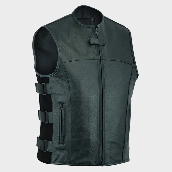 This Tactical Black Leather Biker Vest brings rugged utility and timeless motorcycle styling together. Designed from full-grain leather, it resists wear while molding to your form. The front zipper, secured by a snap tab, ensures wind protection and a clean front appearance. Adjustable side strap buckles allow you to dial in your fit, even when layering. Two zippered waist pockets keep essentials secure on the road. The real standout feature is the smooth, uncluttered back panel an ideal canvas for patches, embroidery, or club branding. The low stand collar delivers a clean, no-nonsense look. Reinforced stitching and strong hardware throughout make this vest a reliable companion for miles of riding.