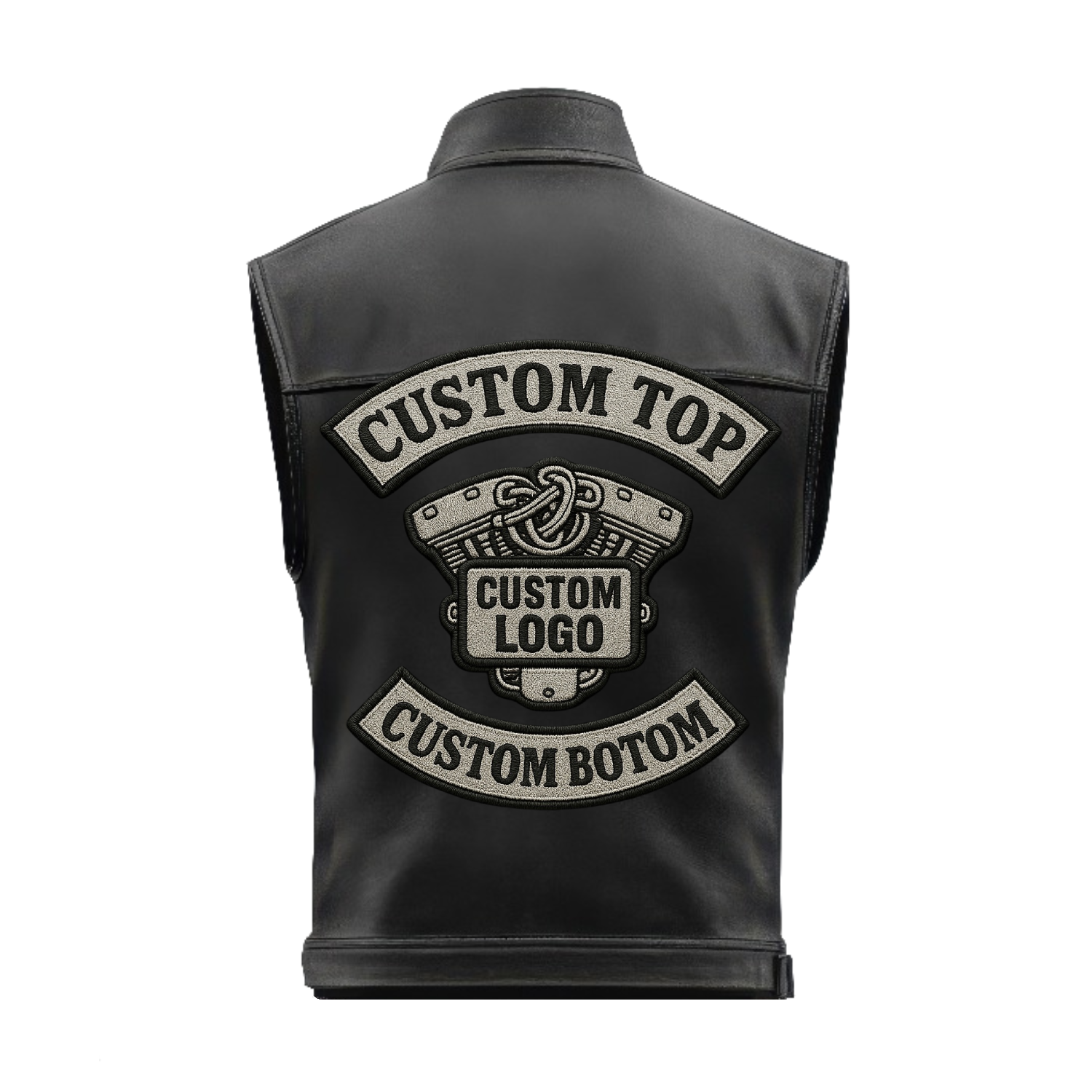 The vest is cut in a modern club/SOA profile with a clean collar and streamlined front that layers neatly over tees, flannels, or hoodies. Dense cowhide resists abrasion yet softens with use; double-stitched binding at armholes and hem locks down stress zones to keep the silhouette crisp season after season. Storage stays practical without bulk: two snap-down chest pockets for quick-grab items and two interior pockets to secure valuables on long runs. The back proportions are tuned for the classic three-piece configuration—top rocker for club/chapter name, center V-Twin emblem, and bottom rocker for city/state, a layout understood across motorcycling culture for immediate identification. The uninterrupted panel and balanced spacing support oversized embroidery or layered patches with clean stitch penetration through heavy leather. Choose high-contrast thread to make the engine artwork pop, or tone-on-tone for a stealth build—the full-grain base rewards both approaches with depth and long-term durability.
